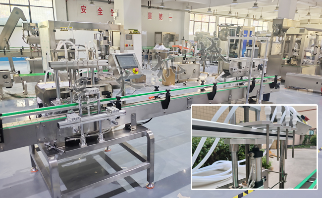 蠕動泵灌裝機由蠕動泵頭、電機驅(qū)動、橡膠管道等主要設(shè)備組成,采用伺服電機驅(qū)動,實現(xiàn)轉(zhuǎn)速精準調(diào)節(jié),灌裝量依然能保持準確,灌裝誤差僅在±0.5%之間,采用衛(wèi)生級硅膠或氟橡膠管,耐腐蝕、更換配件方便簡單。這種多頭自動灌裝小瓶水設(shè)備一次可以灌裝多個容器,有幾個灌裝頭就可以灌裝幾個容器,每個灌裝頭配備缺瓶止灌功能,避免空灌浪費,比如說四個灌裝頭,只有三個瓶子,那另外一個灌裝頭就不會出料,沒有感應(yīng)到容器的位置,所以說,不會浪費原料,也不會對設(shè)備造成影響。
