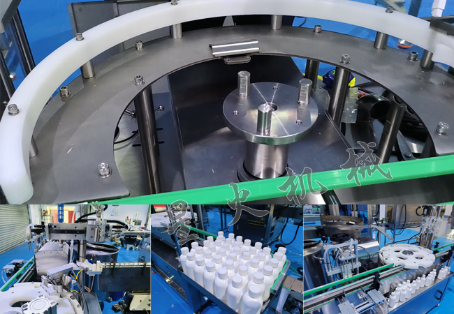 液體灌裝旋蓋機設(shè)備的灌裝過程流暢且自然,當(dāng)容器被定位到指定位置后,灌裝頭準(zhǔn)確下潛到容器中一部分,并開始灌裝物料,這里的灌裝頭是邊灌邊升的,待達(dá)到預(yù)設(shè)值后自動停止灌裝,灌裝頭升起。灌裝頭具有防滴漏功能,可防止物料滴漏污染瓶身。通過準(zhǔn)確的電子稱重傳感器控制灌裝的重量,自動除皮,保證灌裝重量的準(zhǔn)確性。旋蓋過程亦是迅速高效,旋蓋速度可根據(jù)灌裝速度調(diào)整,使灌裝和旋蓋能協(xié)調(diào)工作,具備自動理蓋、上蓋、旋蓋功能,扭矩精準(zhǔn)可調(diào),適用于多種規(guī)格、多種產(chǎn)品的旋蓋。