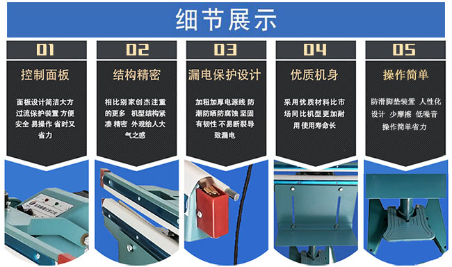將裝填好產(chǎn)品的包裝袋的開口方向放在加熱區(qū)內(nèi)10CM左右,快速踏下腳踏板將封口處緊壓其下,此時加熱指示燈亮起,等指示燈熄滅后,放松腳踏板,取出產(chǎn)品。