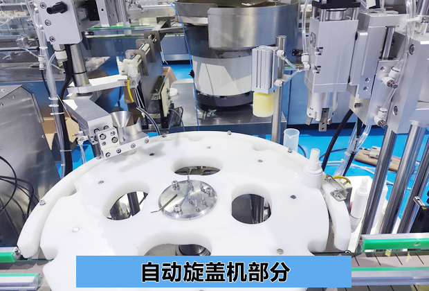 這一部分主要是負(fù)責(zé)對容器旋蓋,采用旋轉(zhuǎn)和直線振動(dòng)盤理蓋方式,兼容噴霧蓋、螺紋蓋等多種形狀的蓋子,自動(dòng)整理上蓋。上蓋采用氣缸下壓方式,壓蓋頭內(nèi)置真空吸盤,落蓋穩(wěn)準(zhǔn),不掉蓋,自帶抱瓶裝置,保證機(jī)械抓手高速旋蓋時(shí),瓶子不會倒。