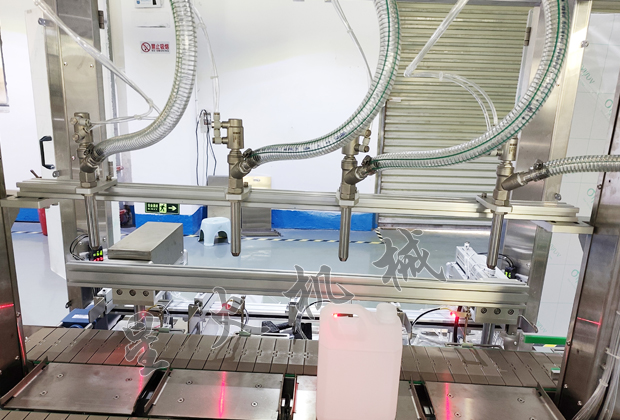 這款4頭液體稱重灌裝機是用來灌裝1-5L液體的設備,和傳統的灌裝設備有所不同的是,它采用自動稱重灌裝方式,是一種現代化的全自動消毒液灌裝機,包括供料系統、稱重系統、控制系統等,實現全自動進桶、計數、灌裝、出桶過程,支持液面上/液面下灌裝方式,并配備防滴漏裝置,防止液體滴漏。該設備適用范圍廣,靈活性強,能滿足不同產品及不同規格的液體物料灌裝。