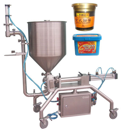 本機是我公司針對粘稠較高并帶有顆粒的醬狀食品而研發(fā)設(shè)計的新款灌裝機設(shè)備,另外,該機還有配有物料自動攪拌功能及灌裝腳踏開關(guān),其外形結(jié)構(gòu)簡單,灌裝精度高,操作方便,灌裝速度及灌裝量均可任意調(diào)節(jié),出料口采用加大型號,不易賭賽,是一款中小企業(yè)理想的盒裝拌醬灌裝機設(shè)備。
