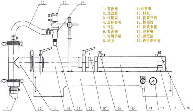 10、旋動節流閥一01和節流閥二06,調出合適的抽料速度和灌裝速度。為提高工作效率,可將抽料速度01調快一點,灌料的速度06調慢一點(不要使灌裝過程有物料或氣泡沖出瓶口)。