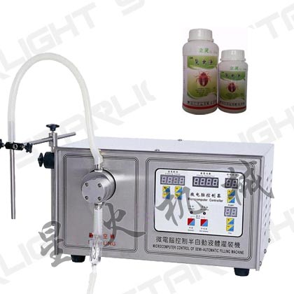 特別適用于生物制劑,硫酸、農藥、敵敵畏、五步倒、除草劑、殺蟲劑、除蟲劑、噠螨靈等強腐蝕性產品小型定量灌裝機樣品: